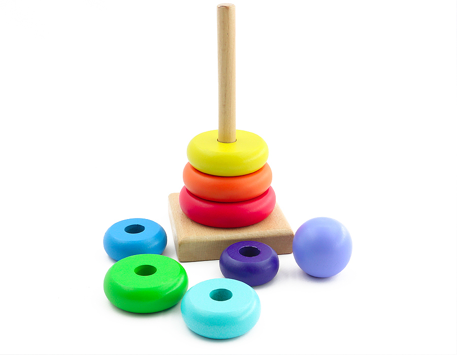 2. Учить складывать пирамидку из 3-х колец разной величины. При подборе нужного кольца ребенок ищет каждый раз большое кольцо (из оставшихся): «Возьми большое кольцо», - ребенок находит и надевает его на стержень.